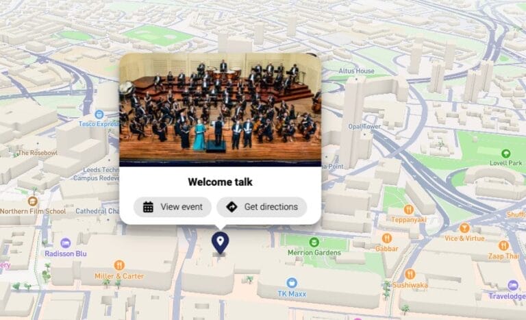 For customers using our Events System, in-person events can be seamlessly integrated into the personalised map. Highlight event locations and serve relevant content alongside relevant events, ensuring attendees have all the information they need in one place.